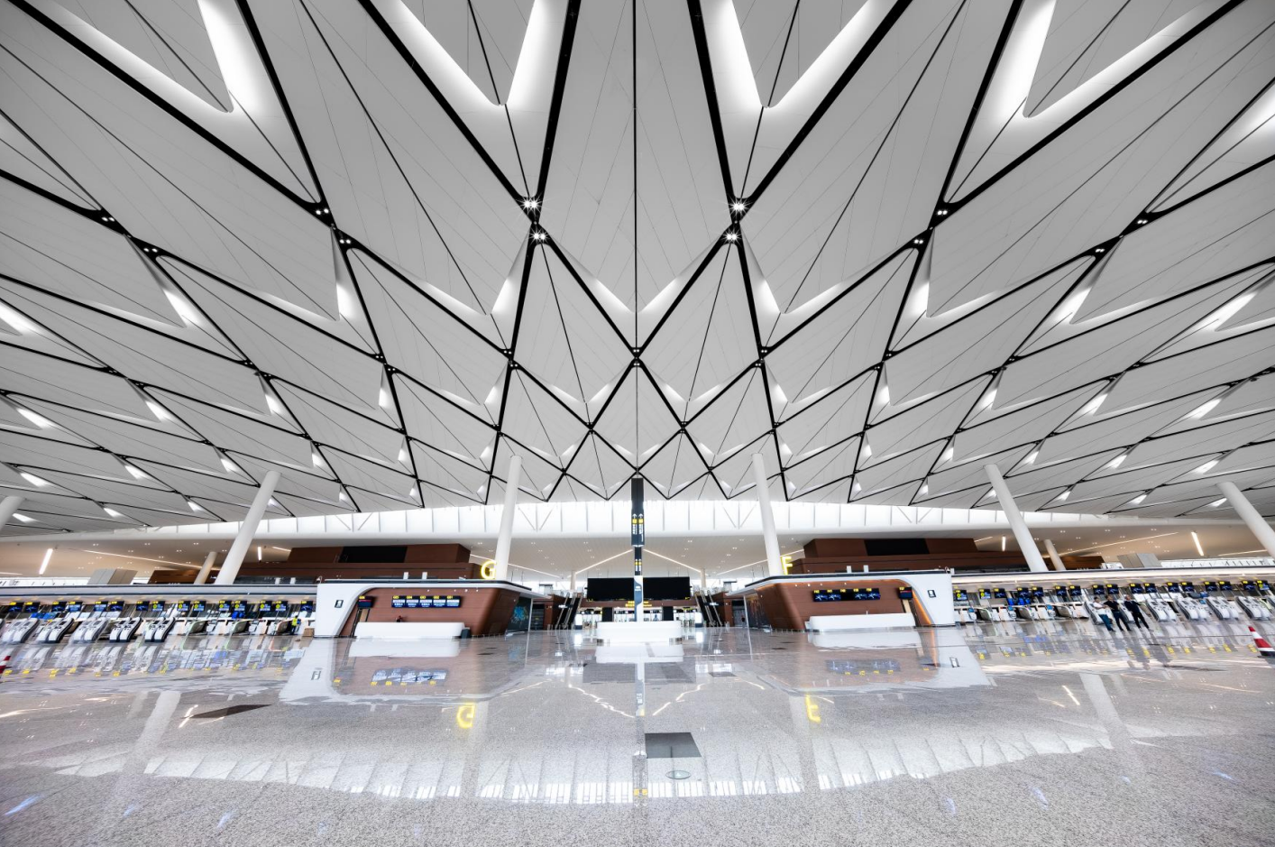 成都天府國際機場為4F級國際機場、是絲綢之路經濟帶中等級最高的國際航空樞紐之一,中國首個“手拉手式”航站樓,總面積71萬㎡,每座航站樓有3萬㎡的羽毛狀吊頂與“太陽神鳥”的整體造型呼應 。航站樓共設置83個廊橋機位,能夠滿足2025年2800萬人次國內旅客吞吐量和1200萬人次國際旅客吞吐量的需求。預計本月開通運營。